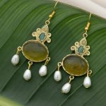 گوشواره آویز برنج _ طرح گل _ نگین بیضی حنایی _ آویز مرواریدی