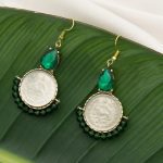 گوشواره آویز برنج _ پلاک سکه _ نگین الماسی سبز _ نگین سبز پایین