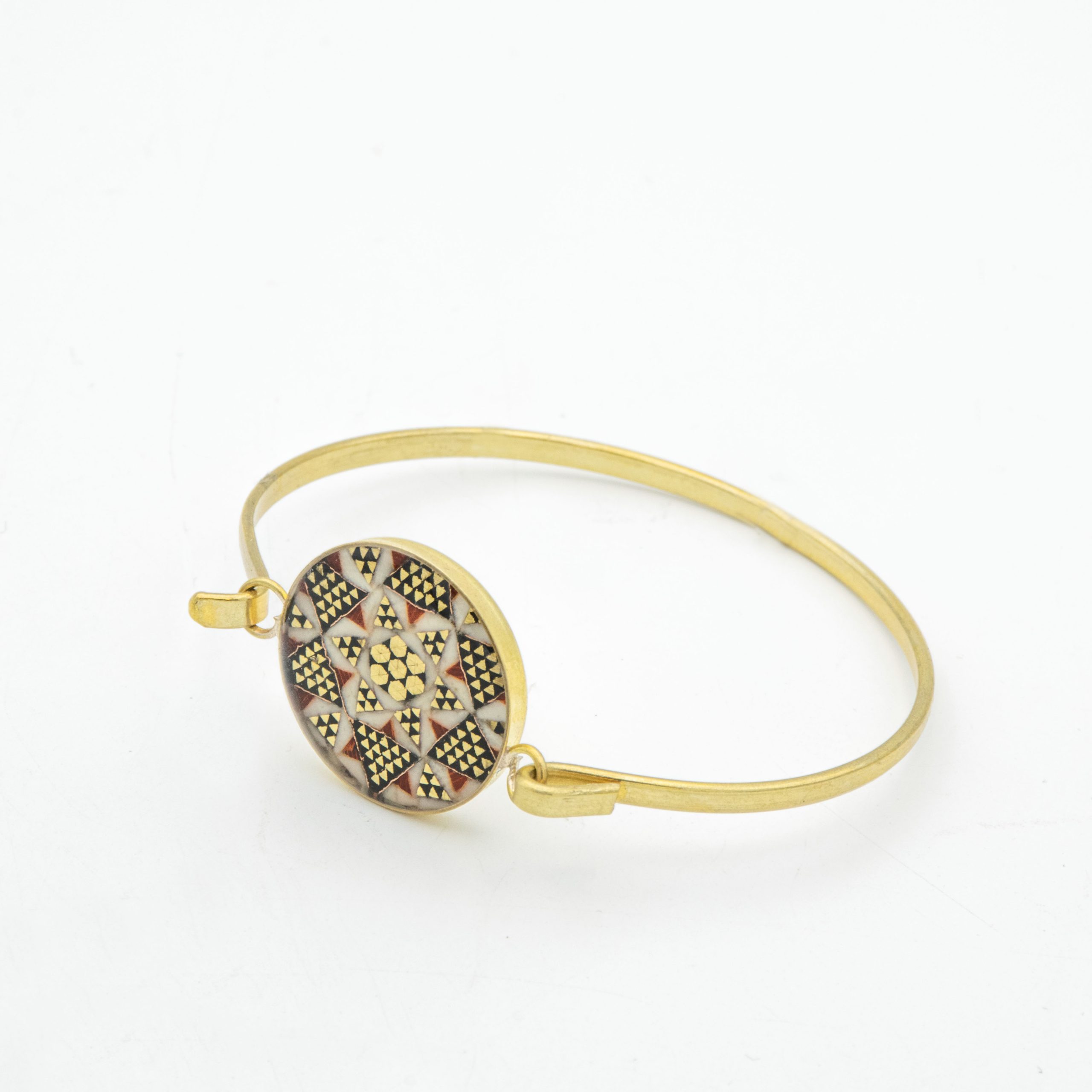 دستبند برنج خاتم کاری _ پلاک دایره خاتم ستاره و شش ضلعی _ مشکی طلایی سفید