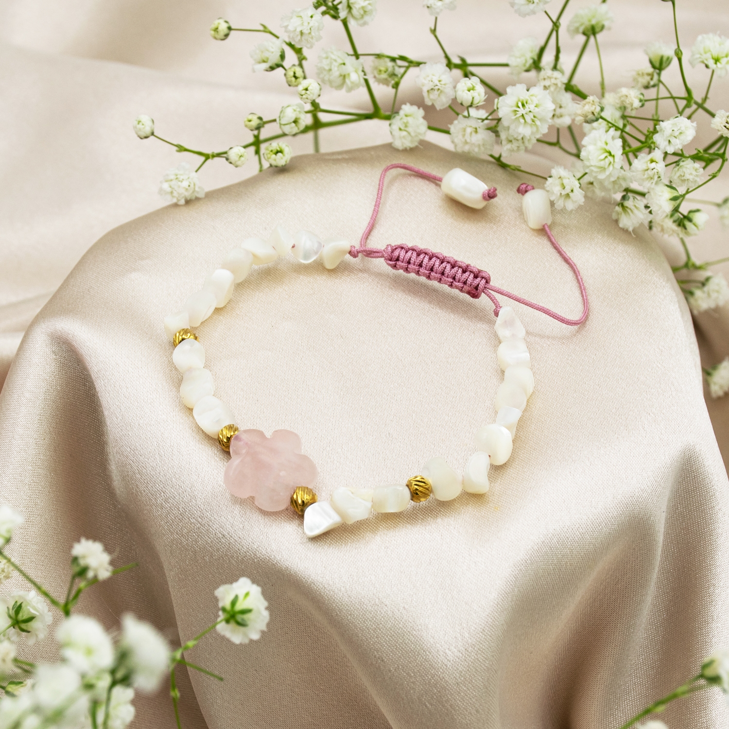 این دستبند با ترکیبی از سنگ طبیعی رز کوارتز و مهره‌های درخشان صدف ساخته شده؛ پیوندی ظریف میان انرژی عاشقانه‌ی زمین و لطافت دریا. رز کوارتز با رنگ صورتی ملایمش، نماد عشق، آرامش و پذیرش است و صدف با درخشندگی طبیعی‌اش، حس آرامش، پاکی و لطافت زنانه را تقویت می‌کند.