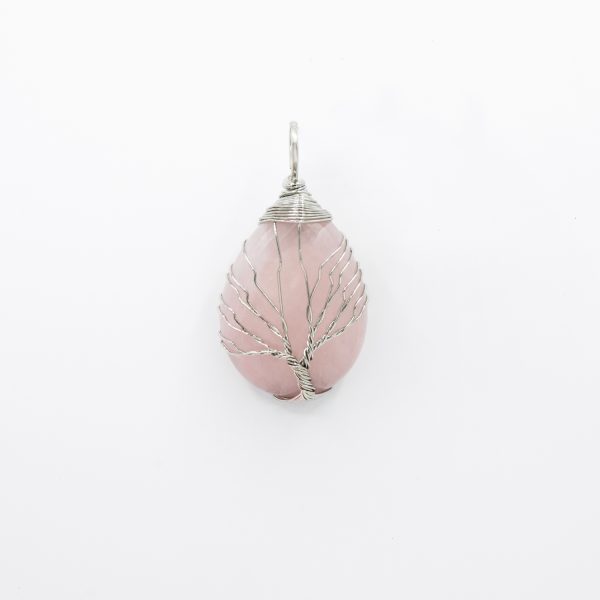 💗 پلاک گردنی رز کوارتز – طرح اشک با سیم‌پیچی استیل