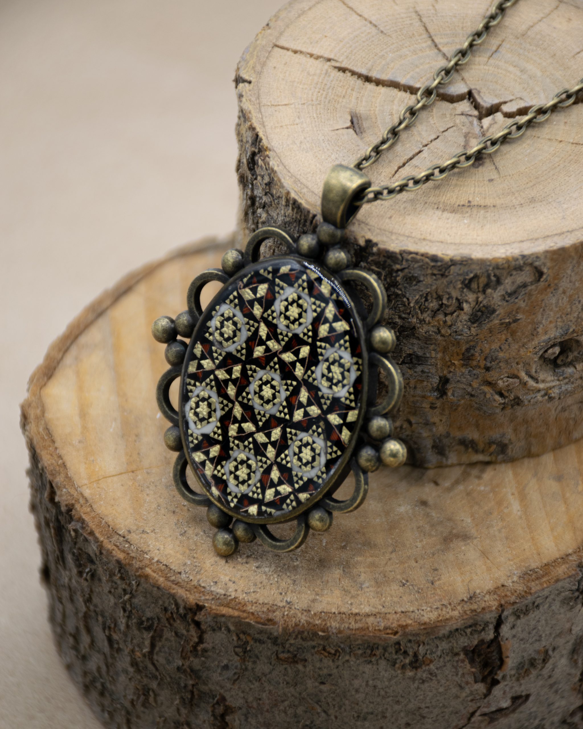 گردنبند زرد قلم و خاتم‌کاری، تلفیقی از هنر و ظرافت است. نقوش زرد قلم با دقت و ظرافت بر روی سطح گردنبند طراحی شده‌اند و خاتم‌کاری با استفاده از قطعات کوچک چوب از درختانی مانند گردو و بلوط و… ، استخوان شتر و فلز، زیبایی آن را دوچندان کرده است. این گردنبند، نمادی از هنر اصیل ایرانی است و می‌تواند به هر استایلی جلوه‌ای خاص و متفاوت ببخشد.
