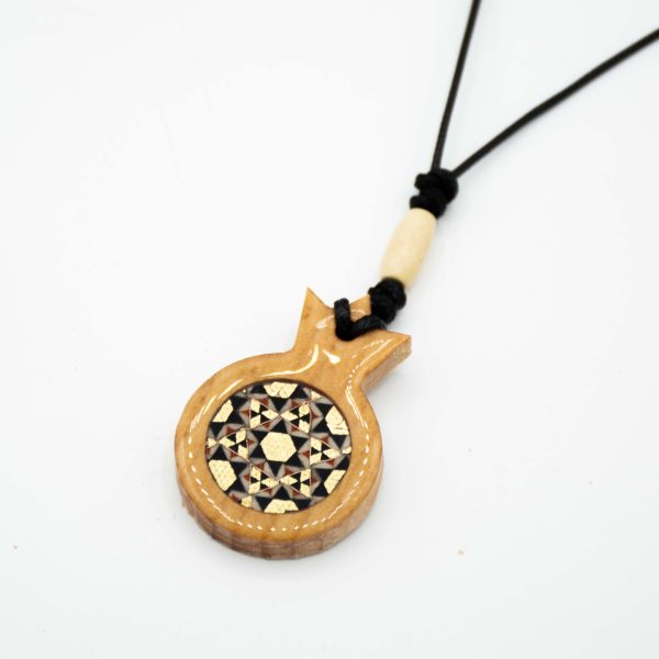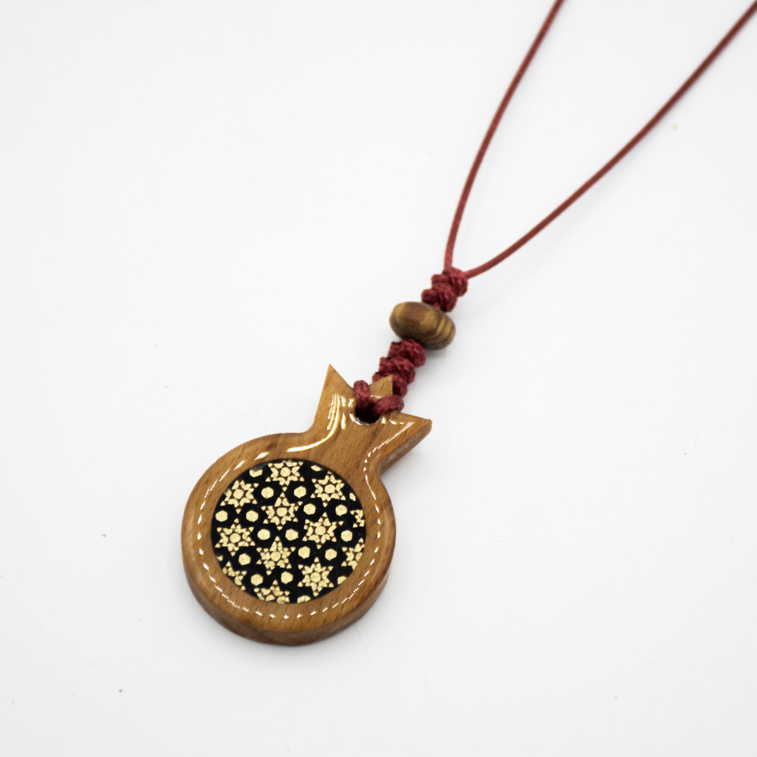 🌳 هدیه‌ای از دل طبیعت و هنر: گردنبند چوبی با طرح انار و هنر خاتم‌کاری 💖