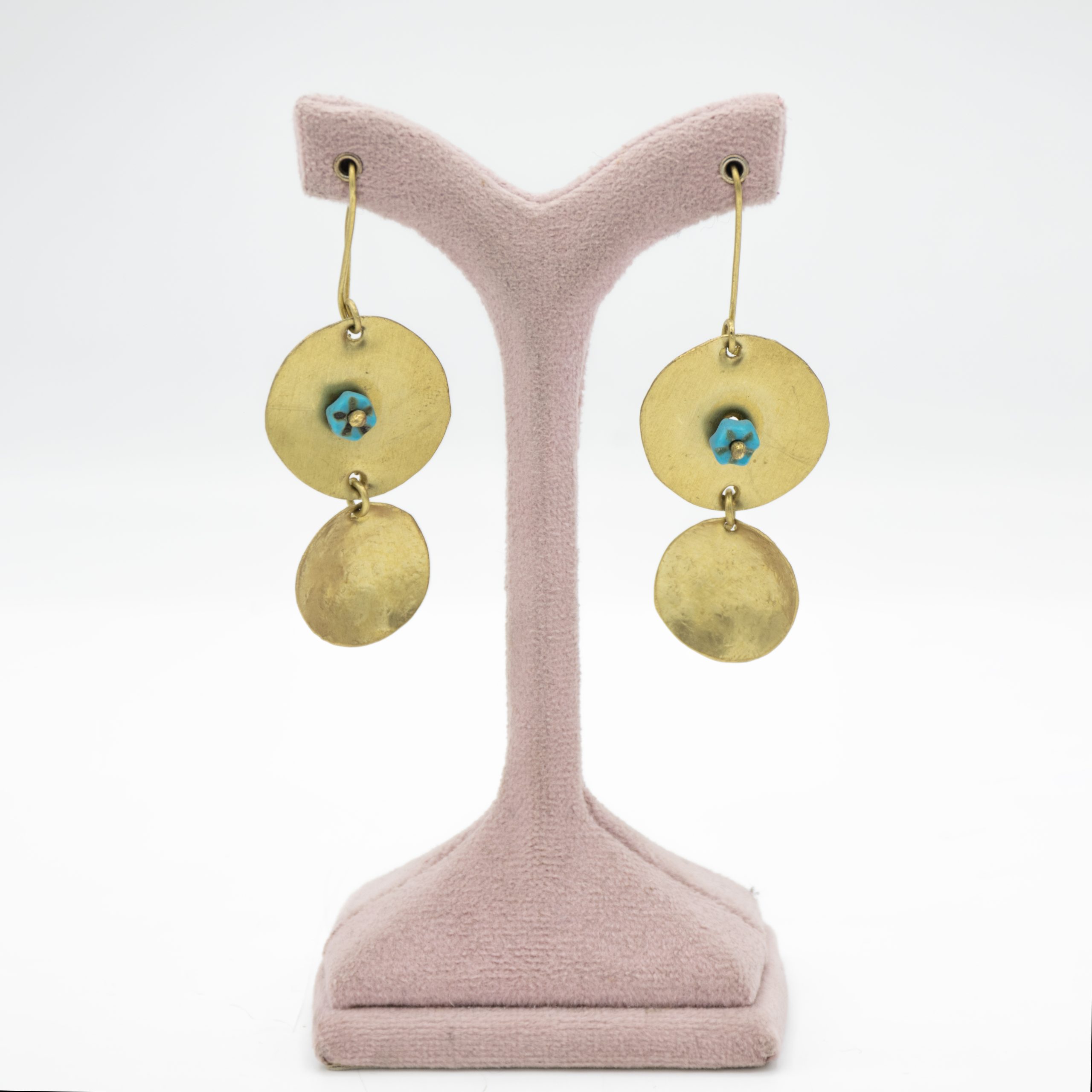 این گوشواره خاص، با ترکیب خلاقانه‌ی **دو دایره‌ی برنجی** و نگین زیبای **سنگ فیروزه** در مرکز طرحی شبیه به گل، روحی زنانه، طبیعی و آرام را به استایل شما می‌بخشد. الهام‌گرفته از فرم‌های ساده و زیبای طبیعت، طراحی آن پر است از حس لطافت و انرژی مثبت.