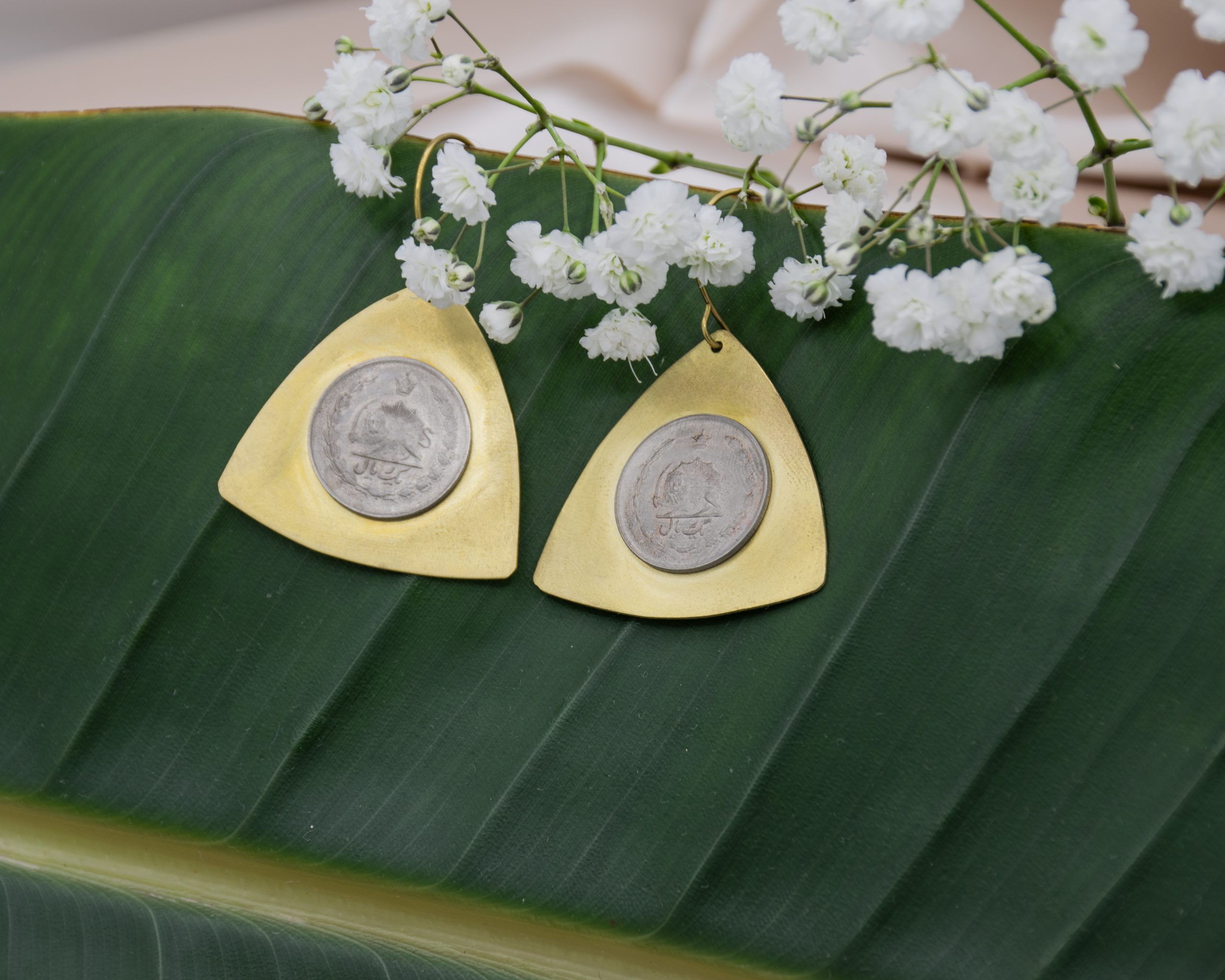 گوشواره آویز برنج – طرح مثلث _ با پلاک سکه