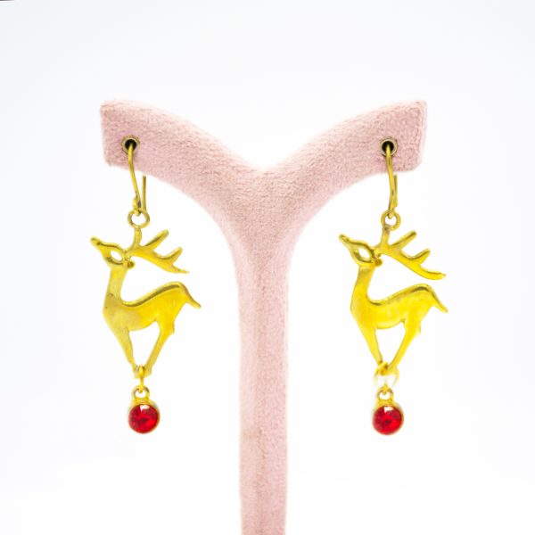 **گوشواره آویز برنج _ طرح گوزن و نگین قرمز**